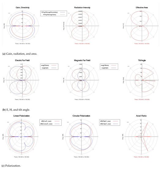 Moreover, antenna efficiency depends upon Equation (2) where and indicate the resistance of radiation and losses, respectively; such losses are due to , , and . We mention here the dielectric resistance, which helps designers to choose their dielectrics carefully with the minimum of losses; especially, tg(), the electric loss tangent, and tg(), the magnetic loss tangent, expressed in Equation (3) where complex permittivity and permeability are expressed as in Equation (4).