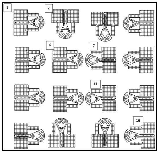 For this purpose, we coded the different cases [0, 1, 2, 3] corresponding to S—south, N—north, E—east, and W—west, as shown in Figure A5. Then, we listed all the possible arrangements of dual cases. can be placed on or under the , and it can also be placed beside the from the right or from the left. All the cases (16 × 4 = 64) are illustrated in Table A2. The first column lists all the possible dispositions/codes. The second and the third column are devoted to horizontal dispositions. The forth and the fifth columns concern vertical dispositions. Hence, each disposition is described as being horizontal or vertical. For horizontal cases, transmission can occur from left to right → (coded 0) or from right to left ← (coded 1). For vertical cases, transmission can occur from down to up ↑ (coded 2) or from up to down ↓ (coded 3). In Figure A6, many cases are studied in both a horizontal and a vertical way.