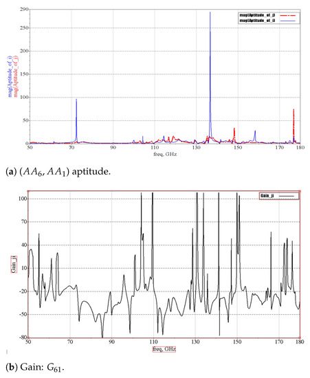 Table 3 provides a performance comparison of our work vs. those in [34,35,36,37,38,39]. Antenna types are mentioned in the last column, and the sizes are presented in the second column, showing that our antenna is not greater than 1 mm2, and our bi-wide-band antenna operates on two wide bands, whereas the other antennas use only one band. The best frequencies (according to ) are presented in the fifth column. The bandwidth of each case is shown in the third column. We can consider our design satisfactory, due to its gain (shown in the fourth column) and its two UWB bands.