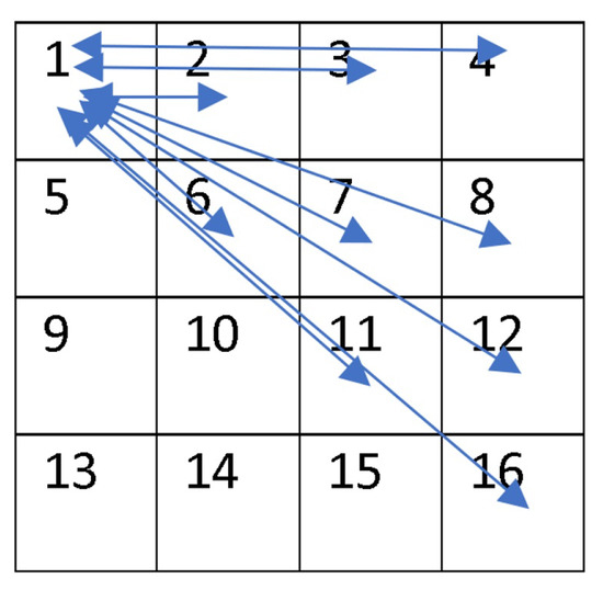 The studied disposition is shown in Figure 13 as IP-antennas () in a square grid so 16 are enumerated from 1 to 16. Each can transmit to on exclusive channels, chosen as having the optimum (available and highest) transmission gain. In the case that would transmit data to , noted by , we have to respect the above rules (Rule 1 to Rule 4) to deduce the right frequency set band (channels ) corresponding to the maximization of . Thus, we obtain a bijection between and . Figure 14a,b illustrates the case of and , and Figure 14a depicts (acceptance aptitudes of –, calculated by means of Equation (6). Figure 14b shows the gain , calculated using Equation (5). We have represented the gain from to . The acceptance aptitude of is the inverse of the linear given by Equation (6):