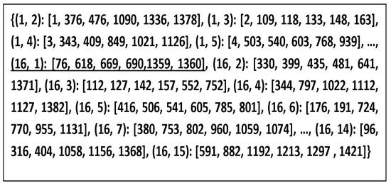 Where U is an integer counter of the sub-channel assignment number in {1, 2, 3, 4, 5, 6}; G is a set of for each deduced from Equation (5); is a set sorted in descending order for each according to ; and Alloc is an array of 1440 (sub-channels) structures composed of (V: N: , where V indicates if the sub-channel is allocated, is the number of the transmitting antenna (), and is the number of the receiving antenna (), and N is order number of assigned sub-channels. The algorithm is optimized by considering Equation (5). According to this equation, the received power decreases considerably when the inter-antenna distance increases. The set of 240 should be sorted in descending order by the distance between and , as presented in Figure 16. Actually, the number m of assigned sub-channels per (here ) is an important parameter. When it is changed, we modify the sub-channel width , where GHz and n is the number of antennas (16 = 4 × 4). However, whenever we execute Algorithm 1 we will obtain a new frequency plan per . A sample of an assignment plan resulting from the proposed Algorithm 1 is shown in Figure 17, where each of the 240 antenna couples is assigned six exclusive sub-channels. This can help to hop frequencies and obtain easier access.