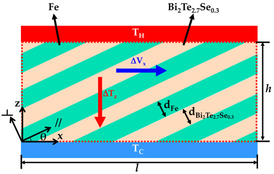 The structure of ATMTD contains two alternately stacked layers, Fe and BTS, with thickness dFe and dBTS. After the stacking layer plane is tilted at an angle, θ, against the ATMTD surface (θ ≠ 0° or 90°), the anisotropy of transport parameters comes from two alternately stacked layers, parallel and perpendicular stacking-layer planes, as well as tilt. This means that the Seebeck coefficient of Fe/BTS ATMTD is anisotropic and the off-diagonal Seebeck coefficient of Fe/BTS ATMTD is non-zero, which provides the theoretical background to see transverse TE effect. As shown in Figure 1, when a temperature gradient (ΔTz) in Fe/BTS ATMTD is established along the z-axis under the hot-side temperature (TH) and cold-side temperature (TC), it will yield a transverse TE electromotive force (ΔVx) along the x-axis. The ΔVx can be expressed as follows: