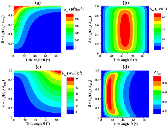Figure 3. Thickness ratio (δ) and tilted angle (θ) dependences of (a) electrical conductivity σxx; (b) transverse Seebeck coefficient Szx; (c) thermal conductivity κzz; and (d) transverse figure of merit ZTzx of Fe/BTS ATMTD.