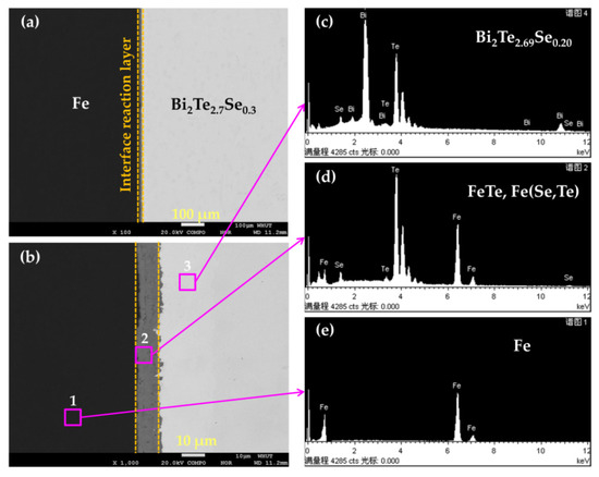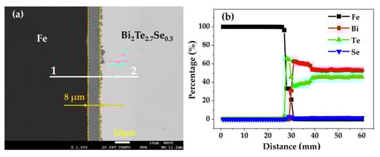 The BEI and line distributions of Fe, Bi, Te and Se elements were also conducted on the Fe/BTS interface by a wave-dispersive spectrometer (WDS), as shown in Figure 6. It is clear that three-layer interfacial structure is present from the Fe to BTS sides. The line distributions show that all the elements have a small amount of diffusion at the interface. However, the thickness of interface reaction layer is only 8 μm, which means that the interfacial reaction between Fe and BTS is slight, SPS and two-step WEDM method is suitable for fabricating a high-quality Fe/BTS ATMTD.