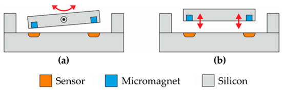 Figure 1. Schematic illustrations of integrated position detection systems based on arrangements of Hall sensors and micromagnets. The rotating device shown in (a) represents microelectromechanical systems (MEMS) mirror scanners or joysticks, among others. The translational arrangement in (b) could be used for an autofocus device, for example. One possibility for manufacturing the depicted assemblies in silicon technology is wafer bonding [13].
