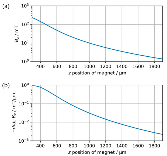 Figure 3. Theoretical calculation of the magnetic field with respect to the position z of a cylindrical magnet with diameter d = 500 µm, length L = 590 µm and magnetization M = 500 mT/µ0. Note that z = 295 µm (= L/2) corresponds to contact between the magnet and the active sensor cell according to Figure 2, neglecting the presence of the Si substrate in this theoretical analysis. (a) Magnetic flux density in z-direction Bz. (b) Gradient of magnetic flux direction in z-direction.