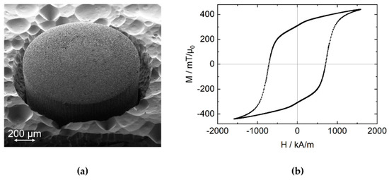 Figure 4. (a) Scanning electron microscopy (SEM) micrograph of an embedded micromagnet with a diameter d = 1000 µm and L = 590 µm made of NdFeB micropowder which was solidified with an Al2O3 layer deposited by atomic layer deposition (ALD). The surface roughness of the magnet results from the powder-based manufacturing process. The silicon substrate was partially removed by XeF2 etching for illustration. The rough surface of the remaining substrate is typical for XeF2 etching. (b) Ferromagnetic hysteresis from the magnet in (a) measured by VSM. The magnet exhibits an intrinsic coercivity of Hc = 707 kA/m and a remanent magnetization of Mr = 310 mT/µ0.