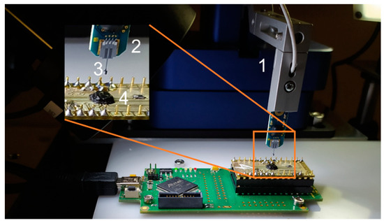 Figure 5. Setup for 1D measurements: the micromanipulator (1) positions a force probe (2) with an attached micromagnet (3) relative to a Hall sensor (4).