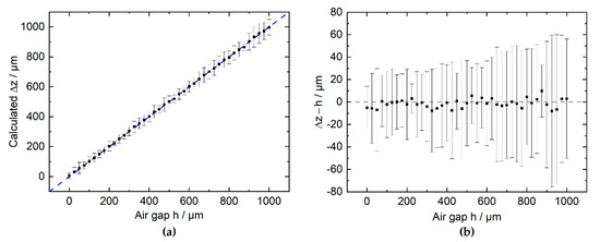 Figure 7a displays the calculated displacement ∆z with respect to the air gap h set by the manipulator. The difference of both positions ∆z-h is shown in Figure 7b.