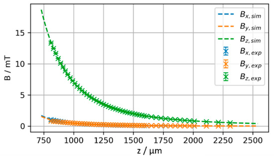 In the case of a perfect axial alignment of the sensor and the magnetization axis, both Bx and By are zero. Allowing an initial misalignment of x0 and y0 explains non-zero Bx and By, as observed in the experiment. Adding x0 and y0 as additional degrees of freedom and Bx and By as fit targets, the fit converges to the solution shown in Figure 9. The resulting parameters x0 = 42 µm, y0 = 39 µm, z0 = 810 µm, M = 357 mT/µ0 are in close agreement to the above fit, but additionally indicate a misalignment of 57 µm in radial direction.