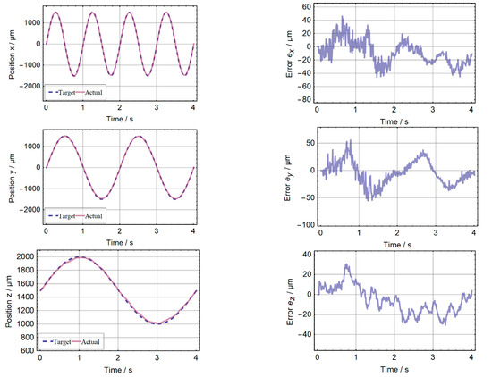 Figure 10. Result of the 3D position measurement. Right: target and estimated (actual) values for the position components x, y and z. Along the trajectory x and y vary within ±1.5 mm, z within ±0.5 mm. Left: the residual error for the individual components staying below 51 µm for all axes.