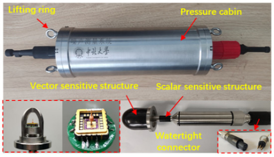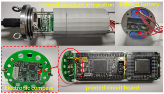 The self-contained MEMS vector hydrophone has ideal low-frequency performance and attitude calibration capabilities. Its internal data storage unit can record the acoustic signals picked up by the sensitive structure of the sensor. In order to accurately record underwater sounds, the sampling frequency and sampling depth of the recorder are set reasonably, and all channels are equipped with high-precision clocks to achieve synchronous sampling between channels. The electronic cabin is powered by a lithium battery pack, and uses a 64G SD Card to ensure that the system can work continuously under water for more than 48 h. The sensitive structure of the sensor is encapsulated in a support frame made of stainless steel in order to protect the microstructure from damage. A cap made of polyurethane material is installed on the outside of the support frame for sound transmission. The overall structure is shown in Figure 3. A pressure-resistant electronic cabin with a hydrostatic pressure resistance of 4.5 MPa was designed, in which the attitude sensor, circuit board and lithium battery were placed, and, in said design, the sensor probe is rigidly connected to the electronic cabin through a watertight connector. The internal structure integration is shown in Figure 4. The north direction of the attitude sensor coincides with the positive direction of the X axis of the sensor, and the real-time attitude data of the sensor are stored synchronously with the acoustic signal to realize the attitude calibration of the hydrophone.