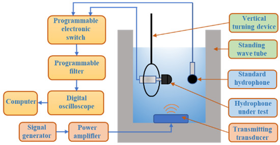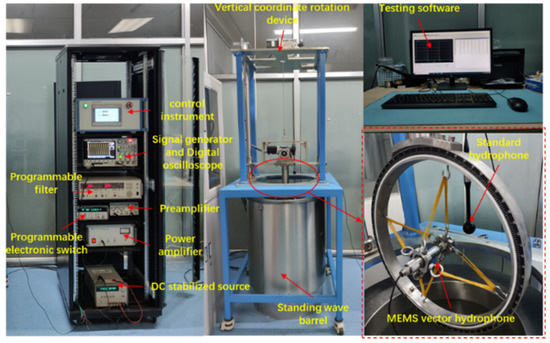 A standard low-frequency hydrophone calibration system is used to calibrate the self-contained MEMS vector hydrophone in a standing wave tube. The calibration process is shown in Figure 5. A sounding transducer is installed at the bottom of the standing wave tube, the vector hydrophone is fixed on the gyro device during calibration, and the working state of the calibration system is controlled by a computer. The sensitivity of the sensor is calibrated by the comparative calibration method [25] and the sensitivity calculation formula is shown as Equation (2) [26]: