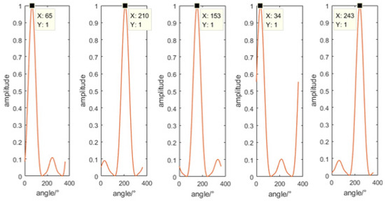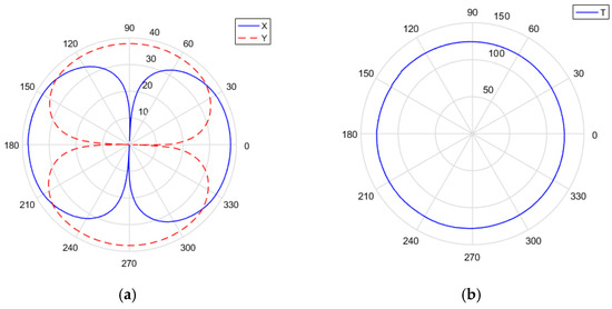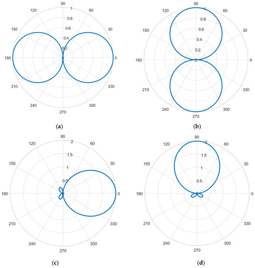 wherein the combined vibration velocity and still have orthogonal dipole directivity, and the directivity is shown in Figure 8a,b. The guide azimuth angle is the main maximum direction of . When is changed in all directions (0–360°) through electronic rotation, and , the direction of the maximum amplitude is the direction of the target.