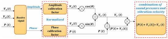 In practical applications, it is necessary to calibrate the amplitude and phase of each channel, and then use the acoustic pressure-vibration velocity combined beamforming algorithm to DOA estimation. The principle of the beamforming algorithm after the amplitude and phase are corrected is shown in Figure 11.