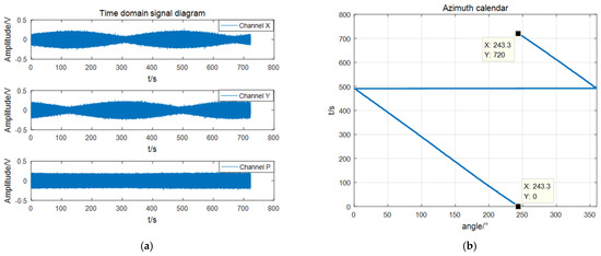 In order to verify the directional algorithm proposed in Section 3, the DOA estimation performance of the self-contained MEMS vector hydrophone was tested in a standing wave tube. The test site is shown in Figure 9. The test process is detailed. First, the MEMS vector hydrophone probe was fixed on the automatic gyroscope. Then, the computer caused the gyroscope to rotate clockwise at a speed of 30°/min. The rotation interval was [180°, −180°] of the gyroscope coordinates, which corresponded to [243°, 0°] and [360°, 243°] of the hydrophone coordinates. At the same time, the sound source at the bottom of the standing wave tube emitted a 250 Hz continuous sine signal (SNR = 23.34 dB). The experimental data were collected and stored through a self-contained collection and storage system, and the system sampling rate was 40 ksps. After the experiment, the combined algorithm was used to DOA estimation in MATLAB. In the calculation, the sliding window step distance was selected for , and the total analysis time was 720 s. The result of the data processing is shown in Figure 12. The signal time domain graph shows that the amplitudes of the X and Y signals were orthogonal to each other in the process of rotation. The azimuth angle changed from 243.3° to 0°, and from 360° to 243.3°. The interval time length was 720 s, the angle changed by 360°, which was the same as the treatment set by the gyroscope, and the trajectory was smooth without jitter. The test results showed that the acoustic pressure-vibration velocity combined beamforming algorithm proposed in this paper can avoid the problem of ambiguity on the port and starboard, and can realize accurate positioning and tracking of the sound source. The indoor measurement angle error is within 1°.