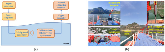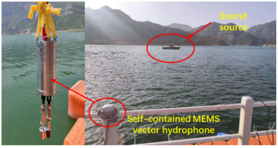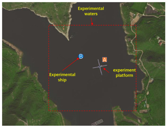 In order to further verify the DOA estimation capability of the self-contained MEMS vector hydrophone, a reservoir experiment was carried out in open outdoor water. The experimental site was selected at the Fenhe Reservoir in the northwest of Taiyuan City. The open area of the experimental water area is 1 km2, and the average water depth is 30 m, which is a relatively good experimental environment. The experimental waters are shown in Figure 13. The experiment was carried out on a cross-shaped floating platform built in the center of the reservoir. The experimental equipment included a mobile power supply, the self-contained MEMS vector hydrophone, a signal generator, a fish lip transducer, a portable GPS locator and a computer.