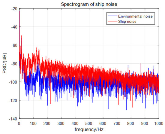 A mobile target test was carried out in the test water area, taking the ship as a single target sound source, and the self-contained MEMS vector hydrophone was lowered from the floating platform to a depth of 15 m underwater. The experimental site is shown in Figure 17. The ship orbited clockwise around the floating dock and used GPS to record the track information. The noise of the speedboat was collected and stored by the self-contained MEMS vector hydrophone. After the experiment, the data were read out for trajectory analysis. The ship noise power spectrum is shown in Figure 18. The power spectral density results show that the frequency band of broadband noise is mainly concentrated in the low frequency range of 50–800 Hz and contains some line spectrum information. The main line spectrum characteristics are 15 Hz, 125 Hz, 140 Hz, 779 Hz and 871 Hz. The line spectrum information was used to track the motion path of the speedboat, and to select the sliding window step distance according to the actual moving speed of the ship. The trajectory diagram drawn in MATLAB through the combined beamforming algorithm is shown in Figure 19. The duration of beamforming statistics was 50 s, and the angle of the ship changed by 20.95° relative to the hydrophone coordinates within 50 s, which is consistent with the track information recorded by GPS. The experimental results show that after attitude calibration and with the combined calculation analysis and processing, it is possible to obtain accurate DOA information from the noise radiated by the ship which was collected by the self-contained MEMS vector hydrophone.