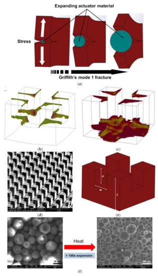 The first type of thermally expandable material chosen for this study is thermally expandable core-shell microsphere particles (TEPs) with sizes varying between 5–50 µm and capability to expand on the application of heat. These microspheres are made of a thermoplastic shell encapsulating a low boiling point hydrocarbon. On application of heat, they can irreversibly expand >100 times their volume as shown in Figure 1f. They are easily available commercially and for the purpose of this study, several grades of these microspheres with different thermo-mechanical properties were purchased from AkzoNobel, Marietta, Georgia, USA, as listed in Table 1.