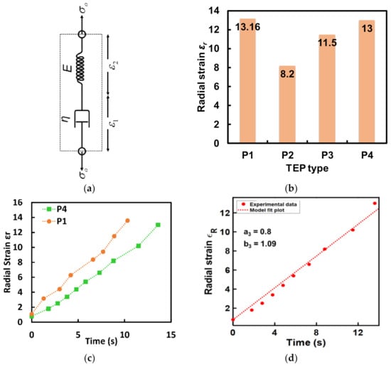 (a) A lumped parameter model of a Maxwell’s material representing a TEP material with the constitutive stresses and strain. (b) Maximum radial strain as observed for 4 different grades of TEP microspheres listed in Table 1. Polymer P1 and P4 show the maximum expanded capacity. (c) Experimental plot of time-dependent radial strain for TEP particles P1 and P4. (d) Experimental data for time-dependent radial strain for P4-TEP particles fitted with the strain equation for a Maxwell’s model showing excellent fit which means that TEP expansion can be modeled as a Maxwell’s material.