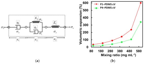 In the case of the thermally expandable elastomer which was made by dispersing the TEP particles inside a PDMS matrix, the viscoelastic behavior of the composite material should be a combination of these two types of materials. The elastomeric PDMS has been previously modeled as a Kelvin–Voigt material [] and since the composite material is subjected to the same temperature, the stress on both the materials would be the same. Hence, the composite can be modeled by coupling a Maxwell unit for the TEPs and a Kelvin–Voigt unit for the PDMS in series as shown in Figure 3a. Where σ1 and σ2 are the stresses on the dashpot and spring of the Kelvin–Voigt element respectively, ε1 is the strain in the dashpot representing the TEPs, ε2 is the strain in the Kelvin–Voigt element of PDMS, ε3 is the strain in the elastic component of the TEPs, η1 is the viscosity of the TEPs, η2 is the viscosity of the PDMS matrix, E2 is the elastic modulus for the Kelvin–Voigt material (PDMS) and E1 is the elastic modulus for the TEPs. Using the Laplace transforms from Table 2, the creep response of this 4-element model for a sudden application of load σo[H(t)] can be easily derived using the constituent equations for each element and is shown in Equation (7) [].
