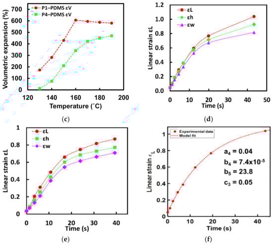 Figure 3b shows the volumetric expansion for the P1-PDMS and P4-PDMS elastomer with different dispersion densities. The volumetric expansion increases non-linearly with increasing mixing ratios with the highest volumetric expansion observed at 600 mg mL−1 mixing ratio for the two TEP polymers. At a mixing ratio higher than 600 mg mL−1 phase separation was observed and TEP particles were seen separating from the PDMS matrix on expansion. The effect of temperature on the volumetric expansion was also measured by heating the test samples prepared with P1 and P4 microspheres at 600 mg mL−1 mixing ratio and varying the temperatures between 120–190 °C and the result is shown in Figure 3c. It was observed that the volumetric strain for the P1-PDMS elastomer is higher compared to the P4-PDMS elastomer, for the entire temperature range. Between temperature 160–190 °C, the volumetric strain drops from ~600% to ~580% for P1-PDMS elastomer however for the P4-PDMS elastomer the volumetric strain keeps on increasing with temperature and maximizes at 470%. The decrease in the volumetric strain for P1-PDMS elastomer could be attributed to the diffusion of the encapsulated hydrocarbon out of particle shell at temperatures higher than the rated maximum temperature for the P1 TEP particles. It was observed that expandable elastomer prepared with polymer P1 showed ~130% higher volumetric strain compared to elastomer prepared with P4 TEP particles. This could be attributed to the fact that P1 particles are much smaller in size compared to the P4 particles and hence are integrated more evenly in the PDMS matrix which would result in a more uniform heat distribution. The time-dependent expansion behavior of the TEP elastomer was also studied. The P1-PDMS elastomer was heated to 150 °C and the P4-PDMS elastomer was heated to 190 °C. The dimension of the expanded sample was measured at different instances of time, and the linear strain corresponding to length, width, and thickness was plotted as shown in Figure 3d,e. The P1-PDMS samples show a higher initial rate of expansion compared to the P4-PDMS sample, which is consistent with the higher expansion rate observed for P1 particles. The experimental data for the linear strain across the length of the test samples were fitted using Equation (7). Figure 3f shows an excellent fit between the model and experimental data with R squared value ~99% when a4 = 0.04, b4 = 7.4 × 10−5, b5 = 23.8, and c3 = 0.05. The parameter values given by the curve fitting tool are also displayed on the plot. Since P1-PDMS elastomer showed a higher expansion rate as well as a higher maximum expansion, it was chosen as the actuator filler material in this study.