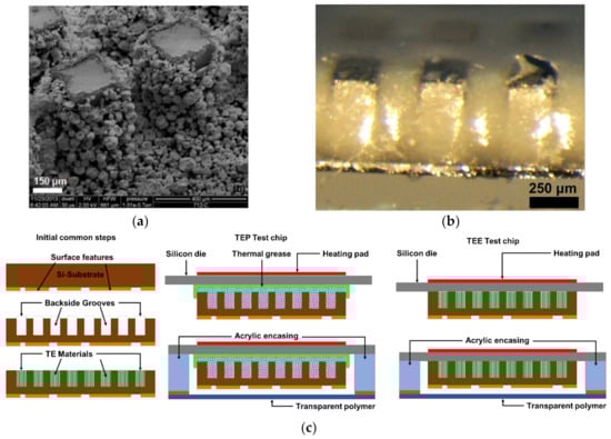 Test device fabrication involved a two-step process. First backside grooves were made on the test chip which were then filled with the chosen TE actuator material for inducing volumetric shattering transience triggered by heat. The detailed process is described in the following sections.