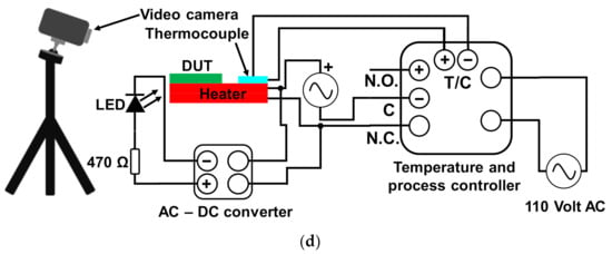 The test chips prepared as described in previous sections were then tested for transience triggered by heat in the test set-ups described as follows. The test chip assembly with TEP and TEE was transferred to a heating pad for a controlled transience test. The heating pad was connected to an AC supply through a normally closed (N.C) internal relay of a 1/16 DIN temperature and process controller. The desired temperature value was set on the controller with a cycle time of 15 s. The feedback loop from the heating pad involved a thermocouple connected to the sensor input pins on the controller. A 650 nm wavelength red LED was also connected to the external AC supply via the same relay of the controller and a universal AC-DC controller in series with a 470 Ω resistor as shown in Figure 4d. The LED is placed close to the device under test (DUT) and is automatically switched on as the set value of temperature is reached. This allows us to monitor the transience time after the set value of temperature is reached while recording the transience of the chip through a digital camera mounted on a stand.