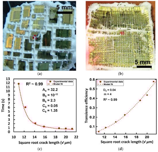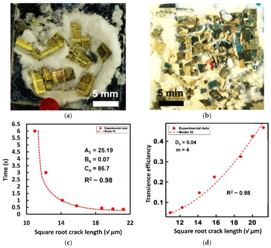 The transience test with the chosen P4 TEP particles as the filler actuator material was performed at 190 °C. Figure 5a,b shows the post transience images of OTS CMOS Si test chips with different initial groove depths. Transience time was calculated for each initial groove depth. The transience time varied between 0.6–0.35 s as the groove depth was varied from 120–450 µm. The square root of groove depth ‘√a’ was plotted against the measured transience time and curve fitted using Equation (6) and the results are shown in Figure 5c. A good fit between the developed theory and experimental results was observed. Next, the number of pieces resulting from the chip shattering were counted from each test chip and used to calculate transience efficiency per Equation (3). A minimum failure probability (transience efficiency) of 5% was observed and a maximum of ~47% by varying the groove length. This transience efficiency data was plotted against the square root of the initial groove depth ‘√a’ and curve fitted using as shown in Figure 5d. A good fit was achieved with an R2 value of 0.98 when constant D3 = 0.04.