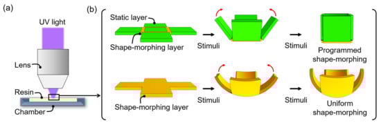 Some research has proposed to overcome these limitations. For instance, Yoon reported a single-layer structure that can respond to temperature or pH [13]. Another single-layer structure was reported by Hao-Li, which can be shape-changing reversible through protic/aprotic stimulation [11]. In particular, they proposed a 4D printer with focused ultraviolet (UV) light, which leads to a successful single-layer self-folding structure. Also, photo-switchable actuators using liquid crystalline elastomers (LCEs), microscale object fabricated by using femtosecond laser or hydrogels were demonstrated [14,15,16,17].