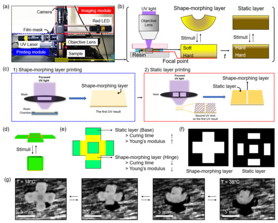 Figure 2a shows the photograph image of the single-layer 4D printing system, composed of a printing module, imaging module, objective lens, and sample holder. We used a UV laser equipped with a beam-expander for the photopolymerization of an object. A film mask is located between the UV laser and an objective lens to print the desired pattern. A red light-emitting diode (LED), which has low interference with the printing module is used in the imaging module for real-time observation of the printing process. The printing and imaging modules are combined using a beam-splitter and lights are focused on the surface of the sample holder using an objective lens (Figure 2b). UV light emitted from a UV laser source is focused on the focal point (red line in Figure 2b) using an objective lens. The hard layer is formulated because the focal point receives sufficient photons for a high degree of polymerization. The soft layer is formulated in the unfocused region when UV light is emitted for a short time (<3 s; middle in Figure 2b) because the unfocused region receives insufficient photons, which results in a relatively lower degree of polymerization than the hard layer. Therefore, in this regard, both soft and hard layers coexist in a single layer, resulting in shape-morphing under stimuli. When stimuli are applied, stress is induced because the soft layer tends to shrink, whereas the hard layer still remains. This results in the folding of the printed object toward the soft layer. As UV light illumination time increases (>3 s; right in Figure 2b), static layers, consisting of only the hard layer, are formed because the soft layer is turned into the hard layer by an increasing degree of polymerization in the soft layer. The shape of the static layer does not change under stimuli because the stress is not induced by applying the stimuli.
