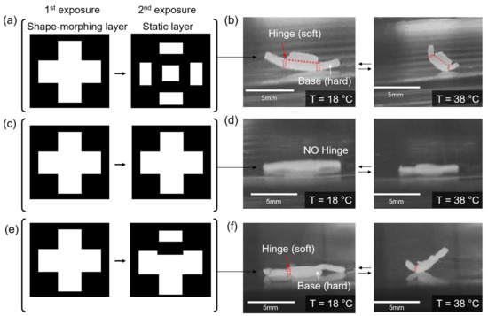 Control study of the shape-morphing material using the various masks. (a,b) Shape-morphing cross-shaped object with four hinges. Depiction of (a) mask pair and (b) photograph image of the object before (T = 18 °C) and after (T = 38 °C) shape-morphing. (c,d) Shape-morphing cross-shaped object without a hinge. Depiction of (c) mask pair and (d) photograph images of the object before and after shape-morphing. (e,f) Shape-morphing cross-shaped object a single hinge. Depiction of (e) mask pair and (f) photograph image of the object before and after shape-morphing.