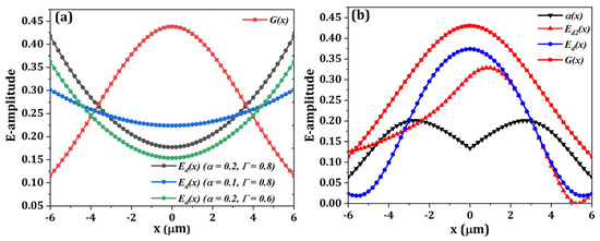 From Equation (5), it is clear that the diffraction field pattern of a bidirectional GC is mainly related to the coupling strength distribution of the grating structure while the amplitude of the E-field is jointly influenced by the grating directionality and the coupling strength distribution. This relationship can be seen from the comparison between the calculated Gaussian field and the bidirectional grating diffraction field shown in Figure 2a.
