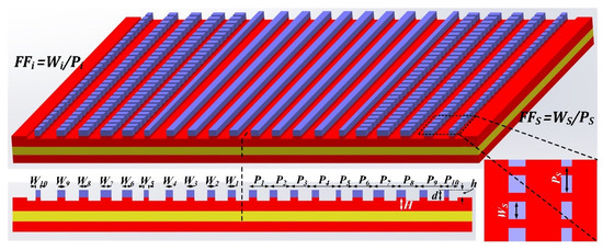 Due to the bandwidth limitation of the grating couplers, two GCs (ABG1 and ABG2) are designed with different central coupling wavelengths, for decreasing the internal Fabry–Perot reflection [35] and improving the channel uniformity. As can be seen, the GCs are designed with waveguide height (H) of 220 nm, polysilicon overlayer height (h) of 160 nm covering the grating region and etching depth (d) of 230 nm in total. The grating structure parameters (grating pitches (Pi), grating filling factors (FFi) and filling factor of subwavelength gratings (FFs)) are carefully engineered for the optimal device performance with a series of numerical calculations by the Finite-difference-time-domain (FDTD) simulation method.