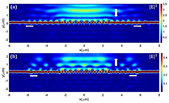 Figure 4. Calculated optical field intensity profile of (a) in-plane coupling and (b) out of plane coupling with the ABG1.