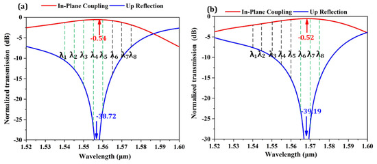 Figure 5. (a) Coupling efficiency and reflection spectra of ABG1. (b) Coupling efficiency and reflection spectra of ABG2.