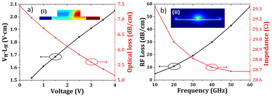 Figure 7. The simulation results of PN phase shifter. (a) Modulation efficiency (dot and black line) and optical waveguide transmission loss (dot and red line) with different applied voltages. The inset picture shows the simulated doping profile of the PN phase shifter. (b) Microwave loss (dot and black line) and impedance of the travelling wave electrode (dot and red line). The inset shows the microwave mode profile.