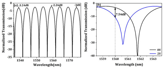 Figure 8. (a) The normalized transmission spectrum of MZI. (b) The optical transmission spectrum varies with voltage.