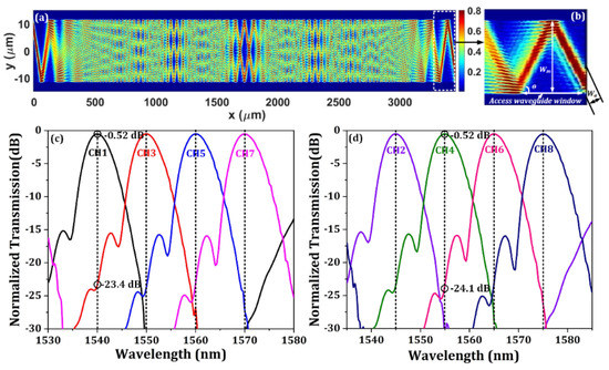 Figure 10. (a) The calculated electric field intensity distribution of AMMI at the wavelength of 1550 nm. (b) The zoomed-in field profile showing the access waveguide window on the sidewall of the multimode waveguide. (c) The calculated transmission spectra of the 1 × 4 AMMI1. (d) The calculated transmission spectra of the 1 × 4 AMMI2.