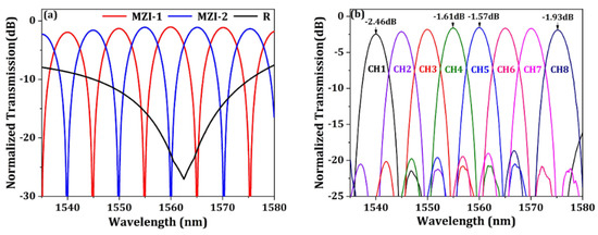 Figure 11. (a) The simulated optical transmission spectra of the MZI optical interleaver. (b) The simulated optical transmission curve of the eight output channels of the interleaved AMMI device.