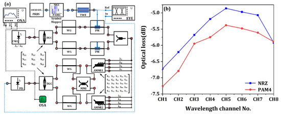 Based on the above modeling and simulation work of the discrete devices, the system-level simulation of the optical transmitter is carried out using the commercially available software of Lumerical Interconnect. The schematic diagram of the system modeling is shown in Figure 12a. As can be seen, the optical transmitter is characterized channel by channel using a tunable continuous wave laser (CWL). As mentioned before, two grating designs are used for the modulators. By substituting the S-parameter matrix of the bidirectional grating coupler (BGC), performance of different wavelength channels can be obtained. An optical network analyzer (ONA) is utilized to obtain the optical transmission spectra where the optical loss can be evaluated. For the dynamic performance, a PRBS generator, symbol mapper for NRZ and PAM4 modulation format and eye diagram analyzer (EYE) were added in the simulation for data transmission test. An optical spectrum analyzer (OSA) is also added to the optical output of the transmitter for frequency-domain analysis of the modulated optical signal.