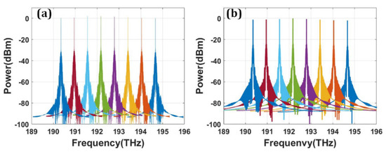Figure 13. The calculated frequency spectra of the eight-channel modulated optical signals (a) with NRZ modulation format. (b) with PAM4 modulation format.