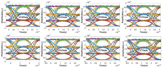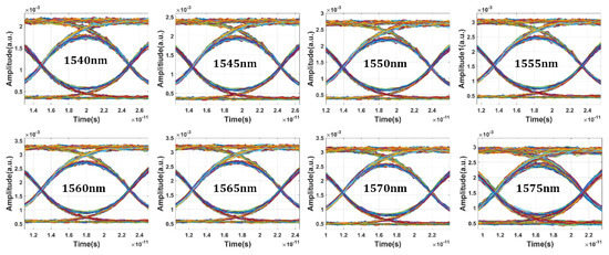Figure 14. Simulated eye diagram results of eight channels of silicon photonic transmitter with NRZ modulation format of 100 Gb/s.