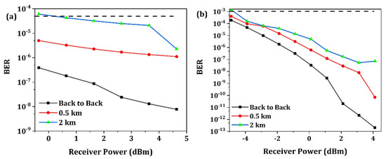 Figure 16. (a) Calculated curve of BER versus the received optical power for 100 Gb/s OOK signal transmission. (b) Calculated curve of BER versus the received optical power for 50 Gbaud/s PAM4 signal transmission.