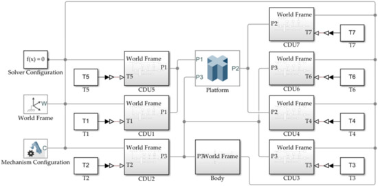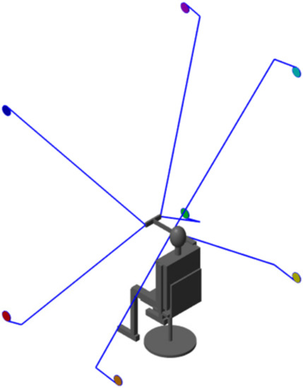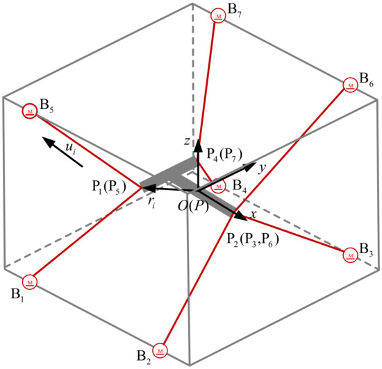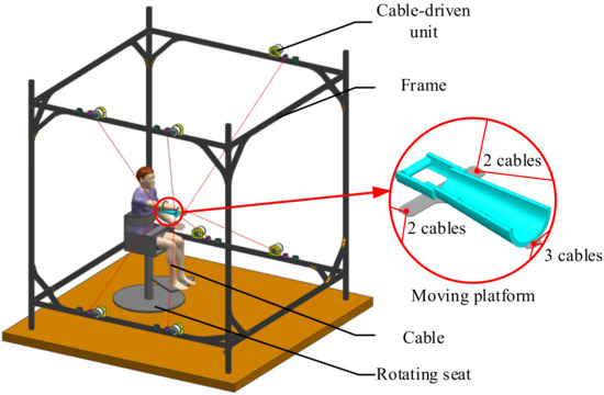 Figure 1. The PCUR consists of seven cable-driven units to move a retractable cable and traction a moving platform to drive the affected limb to perform rehabilitation actions. The patient sits on a rotatable seat, the seat height is adjustable, and the patient’s posture can be adjusted according to different rehabilitation modes. The PCUR’s moving platform can perform six degrees of freedom (DOF) movements in space. It is a redundant drive mechanism. The PCUR has a simple configuration, an ample working space, and adjustable stiffness, which can meet different upper limb rehabilitation training modes [