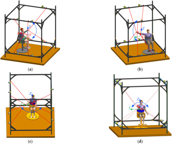 Figure 2. The upper limb rehabilitation training includes the upper limb–shoulder joint extension, the lateral extension, the shoulder–elbow joint flexion, and the internal/external rotation training. The upper limb–shoulder joint extension training moves in extension in the XOZ plane and rotates around the Y-axis. The upper limb–shoulder joint lateral extension training is within the YOZ plane and with rotation around the X-axis. The upper limb–shoulder–elbow joint extension training is performed in the XOY plane, rotating around the Z-axis. The upper limb–shoulder–elbow joint internal/external rotation training is the rotation about the X-axis. Different training modes need to achieve the best training effect under proper cable tension and stiffness conditions. It also ensures the safety and comfort of upper limb rehabilitation training.