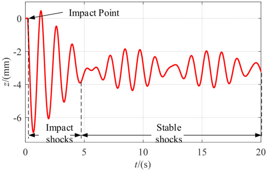 For a given stiffness, the whole system corresponded to a spring system which maintained a stable oscillation in the elastic range. A heavy ball with a mass of 0.05 kg, suspended 200 mm from a moving platform, was in a free-fall motion. When a moving platform was shocked, it was first in an impact shock period, with an increase in the amplitude of the oscillation. Then, it was in a period of stable shocks, with relatively stable changes, as shown in