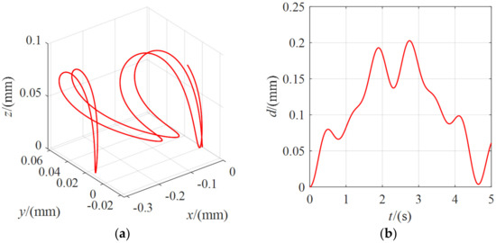 O-xyz and the linear distance curve between the center point and the initial pose were drawn (the following analysis was the same). It can be seen that the position variation of the moving platform was minimal without an external force, with a weak vibration in the 0.2 mm range. This phenomenon is that there was a slight deviation in the tension of each cable input and also by the magnitude of the gravity of the moving platform itself. In practical research, the influence is small and can be ignored.
