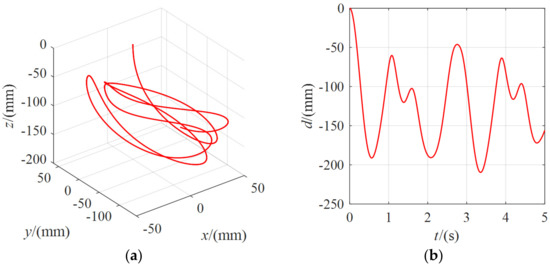 Figure 13. It can be seen that the moving platform had a position change of about 200 mm under the external force. The moving platform moved due to the coupling of external forces and cables. Without considering the system damping, although the motion trajectory of the moving platform in space did not show the characteristics of the periodic motion, it only moved randomly in a particular range. Still, its linear distance showed the regular change features, and the moving platform repeatedly vibrated in a particular range.