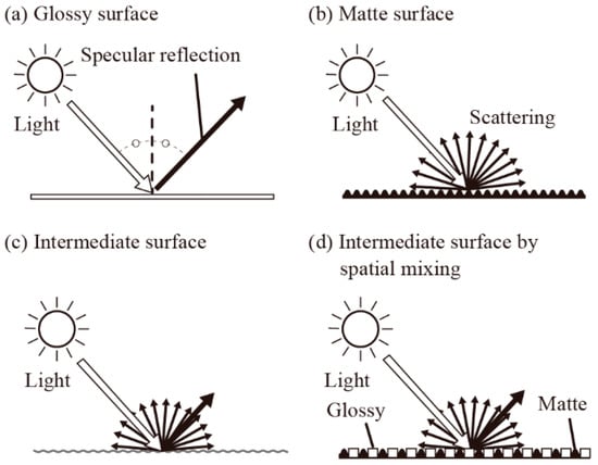 We can roughly classify light reflection into two major types—namely, specular reflection, as shown in Figure 1a, and scattering, as shown in Figure 1b. Ideally, glossy surfaces have specularly reflected light, and matte (rough) surfaces have scattered light. As the surfaces showing the visual texture between glossy and matte have both specularly reflected and scattered lighting conditions, as shown in Figure 1c, the intermediate visual textures may be characterized based on the differences between scattered and specularly reflected light intensity. Our proposal of a “spatially mixed visual texture”, as shown in Figure 1d, was considered to include both of the two types of reflection as well, and thus, we quantified visual textures using the ratio between the intensity of specularly reflected light and that of the scattered light.
